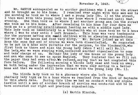 | Informations complémentaires : | E&E 229. Il est de l'équipage de Sarnow (fiche A189) et White (fiche A132). Les sept autres furent faits prisonniers : Walter A. Baker, pilote ; Cedric L. Nussbaum, navigateur ; Walter T. McDermott, radio ; Alvin O. Forney, mécanicien ; Roscoe J. Alderman, mitrailleur gauche ; William H. Binnebose, mitrailleur droite, et Albert G. Bergeron, mitrailleur arrière. Décollés à 08 heures, ils traversent la côte belge à 18.000 pieds et sont atteints par un obus de Flak. Ayant perdu deux moteurs, les deux mitrailleurs blessés par un autre obus de Flak, ils ne peuvent suivre la formation et font demi-tour vers l'Angleterre. Trois chasseurs bimoteurs les attaquent. Les mitrailleurs signalent qu'ils sont à court de munitions et sautent probablement à ce moment. Ils sont encore touchés au gouvernail et aux stabilisateurs et deux des Me 110 sont abattus. Une explosion projette Minnich dans le compartiment du mécanicien. Une explosion des bouteilles d'oxygène projette le navigateur hors de l'appareil. Sarnow le pousse hors de l'appareil et il voit deux parachutes autour de lui. Il évite un étang et atterrit dans un arbre d'un bosquet. Trois jeunes garçons récupèrent son casque, son harnais et sa Mae West et il se dirige vers un autre parachute dans le bois, sans le trouver. Un homme apparaît à vélo et à moitié aveuglé, Minnich le prend pour un soldat Allemand. L'homme enterre son pistolet et ses rations et l'aide à enlever sa combinaison de vol qui se consumme encore. Il est caché le long d'un canal et rejoint Sarnow et White. Des Allemands étant à 200 mètres, ils traversent le canal à la nage pour échapper à la foule qui les entoure. Malgré les efforts de Sarnow, ils doivent abandonner White, qui ne sait pas nager, et se cachent. Gus FRUYTHOF (Auguste), un technicien dans les carrières de sable près de Mol et résistant qui peut parler anglais, leur fournit des salopettes et les emmène un par un dans un bosquet. Il revient avec de la nourriture plus tard. Ils apprennent plus tard que 150 Allemands ont fouillé la zone durant six jours. Sarnow lui soigne ses blessures et ses brûlures. A 22 heures 30, ils quittent leur cachette à un signal convenu et sont cachés dans la maison de Gus FRUYTHOF. Ils y sont nourris et habillés, soignés et le reste de leur évasion est organisée. Il est brûlé à la main droite et au poignet, et autour des yeux. Une infirmière le soigne trois jours. Un "Franz" (probablement François BECKERS) vient les voir deux fois par jour et leur pose des questions d'identification. Gus ne va pas travailler deux jours pour assurer la surveillance mais est rappelé au boulot. Géraldine, son infirmière, s'occupe également des membres arrêtés de leur équipage. Officiellement, elle fait partie des "chemises noires" et travaille pour les Allemands. Le 20 août, ils partent en vélo à Mol. Ils restent une semaine chez Jos et Mary VERBRUGGEN, des gens modestes. Leur jeune cousin Louis (Ludo VAN EECCKHOUT ?) les conduit ensuite chez un vendeur Ford, Édouard DECKX. Récupérés par la section MNB de Moortgat et Wauters, Minnich et Sarnow sont logés du 26 août au 03 (?) septembre chez Edouard DECKX, qui héberge également Jean VAN GYSEGHEM (un des dix évadés du voyage de juillet 1941 avec Deppé) et François BECKERS, de la mission "Muskrat-Vampire". Le Dr GAUMONT vient contrôler sa guérison. Franz BECKERS arrange leur déplacement à Liège. Ils y vont en 3e classe en changeant de train à Hasselt. Franz leur fait mémoriser l'adresse d'une épicerie au 48 Rue des Tanneaux (Tanneurs ?) à Bressoux (chez un M. RAESER selon des documents du SOE) et le mot de passe : "We came from Sgt Turner with instructions from sir Charles to take us to Paris". La femme reste suspicieuse et leur pose un tas de questions. Au cours du souper, elle admet que leur ligne est coupée et qu'ils ne peuvent pas rester chez elle. Ils retournent à Hasselt avec leur guide, qui les conduit chez un dentiste qui lui met des pansements. Le dentiste sort et revient en leur annonçant qu'ils logent chez lui et iront à Bruxelles le lendemain. Il vit avec un boucher qui s'est évadé d'Allemagne. Le Jeudi 2 septembre, une femme les guide à Bruxelles et ils passent à une pharmacie. Minnich et Sarnow sont recueillis le 06 septembre 1943 au poste collecteur de François DELEU au 45 Rue des Fraises à Anderlecht. Il est banquier et est marié à Sophie SLUYS. Charles HOSTE les y a identifiés le 03 septembre et les convoie le 06 chez Yvonne BIENFAIT. Minnich déclare qu'un "Jacques" les conduit ailleurs à Bruxelles en tram, chez une infirmière et que Sarnow part dormir ailleurs ; on le prend en photo et une jeune femme lui apporte une carte d'identité tandis que Alphonse ESCRINIER (fiche B073) lui explique les règles de sécurité. Minnich dort la nuit du 07 juillet au 18 Rue du Cadran à Saint-Josse chez René PONTY. Sarnow n'y passe que la soirée. Voir photo en bas de page. Il est remis par Gaston MATTHYS (EVA "22") à René PONTY (Comète, EVA "22.04") le 15 septembre 1943 en rue, en même temps que Sarnow, mais sera remis à Aline DUMONT après avoir passé une nuit chez PONTY tandis que Anne BRUSSELMANS se charge de Sarnow pour six jours. Somme payée par Anne Brusselmans pour Minnich : 675 FB. Il part loger chez Hélène CAMUSEL au 160 Rue Marie Christine à Laeken, la cache de Aline DUMONT. Minnich décrit Anne BRUSSELMANS comme l'épouse d'un gardien de nuit et habitant à l'étage d'une compagnie de gaz où ele est réceptionniste, "Lilly" a 23 ans mais s'habille en écolière et a l'air d'en avoir 16. Il rencontre Charles Bennett (fiche A151) et Ford Cowherd (fiche A156) chez Hélène CAMUSEL. Aline DUMONT lui fait rencontrer Élie MIROIR dans la rue, et il dort chez lui du jeudi 16 au lundi 20 septembre. Le 20 au matin, Elie MIROIR le conduit à une imprimerie et une dame âgée le conduit chez un forgeron deux rues plus